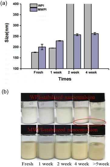 Nanoemulsions stabilized by WPI and MWPI were placed at 4 °C, and 0.02% sodium azide was added in emulsions to prevent bacteria growth. The particle size of nanoemulsions measured by Zetasizer Nano-ZS (Malvern, UK) at 1 week, 2 weeks, and 4 weeks was recorded as the indicator for evaluating storage stability.