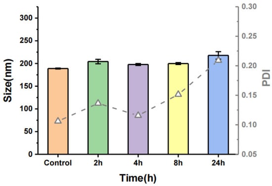 Particle size and PDI of CAS-NEs in the cell culture medium (DMEM) within 24 h; the particle size is represented by bars and PDI by lines.