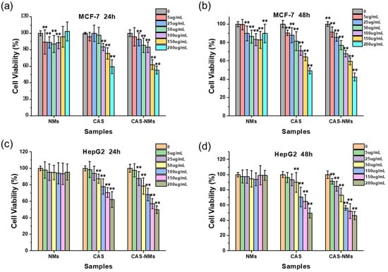 Cell viability of MCF-7 (a,b) and HepG2 (c,d) incubated with blank nanoemulsions (NMs), free casticin (CAS), and CAS-loaded nanoemulsions (CAS-NMs) for 24 h and 48 h respectively, which ** means p < 0.01 as compared to the control group.