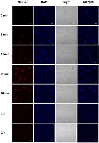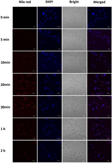 The uptake of the casticin-loaded nanoemulsion in the MCF-7 and HepG2 cells observed by CLSM is shown in Figure 5 and Figure 6, respectively. The casticin-loaded nanoemulsion was labeled with Nile red, and the nuclei were stained with DAPI. After culturing the MCF-7 cells with the casticin-loaded nanoemulsion, a small amount of red fluorescence appeared dispersed in the lysosome of the cells after 5 min. The intensity of the red fluorescence in the cells was significantly enhanced after 20 min, which meant that the MCF-7 cells were continuously taking up the casticin-loaded nanoemulsion in a time-dependent manner. The red fluorescence in the MCF-7 cells gradually became weak and disappeared completely after 2 h. Peng et al. found that nanoparticles were easily absorbed by cells if their size was less than 200 nm []. Because the average particle size of the casticin-loaded nanoemulsion was 180 nm, one possible reason for the gradual disappearance of fluorescence could be related to the decomposition of the casticin-loaded nanoemulsion over a prolonged period of time. Additionally, the areas of red and blue fluorescence did not overlap, suggesting that the casticin-loaded nanoemulsion did not enter the nucleus but stayed in the cytoplasm. The cellular uptake phenomenon in the HepG2 cells was similar to that of the MCF-7 cells, but the optimized uptake time was 30 min.
