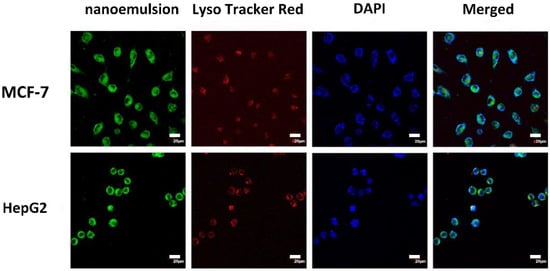 Cellular localization of CAS-loaded nanoemulsions after incubating with MCF-7 and HepG2 for 20 min. Nanoemulsions, lysosomes, and nuclei were labeled by coumarin-6 (first column, green color), Lyso-Tracker red (second column, red color), and DAPI (third column, blue color), respectively. The scale bar in the CLSM image is 20 μm.