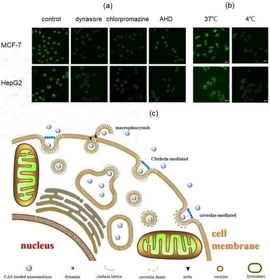 (a) Cellular uptakes of CAS-loaded nanoemulsions after incubating with MCF-7 and HepG2 after treatment with specific endocytosis inhibitors; (b) cellular uptake of CAS-loaded nanoemulsions after incubating with MCF-7 and HepG2 under different temperatures (37 °C and 4 °C) treatment for 30 min. The control was incubated with nanoemulsions without inhibitors. (c) Illustration of the protentional endocytic pathways for uptake of CAS-loaded nanoemulsions.