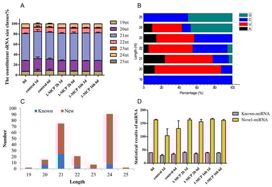 Changes in the distribution and complexity of sRNA in papaya samples. (A) Sizes of the 19–25 nt sRNA readings are classified and distributed under different 1-MCP treatments. The composition of sRNAs at each storage time point is shown, defined as 0 d, 1-MCP 2 h 1 d and 6 d, and 1-MCP 16 h 1 d and 6 d. The rRNA and tRNA sequences were deleted. (B) Base preference distribution of different sRNA reads. (C) sRNA read length classification distribution of known and novel miRNAs. (D) Statistical results of miRNA for each sample, including known and novel miRNAs.