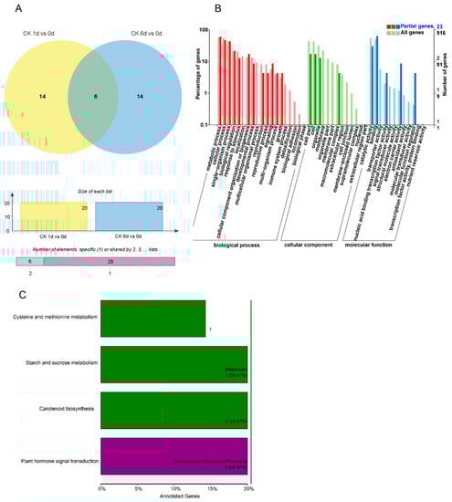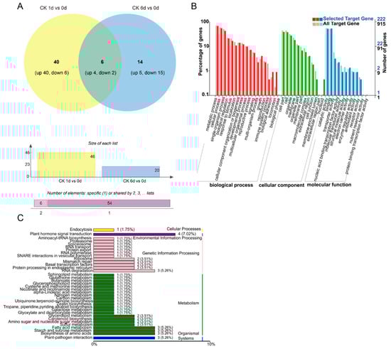 DEM (differentially expressed miRNA) analysis under control conditions during the fruit ripening stage. (A) Number of DEMs in papaya fruit at 1 and 6 days after treatment (DAT) compared to 0 DAT under control conditions. The Venn software package (http://bioinformatics.psb.ugent.be/webtools/Venn/) was used for the Venn diagram. (B) GO classification of the predicted target genes in the comparison of 1 and 6 DAT with 0 DAT. (C) KEGG classification of the predicted targets of target genes in the comparison of 1 and 6 DAT with 0 DAT.