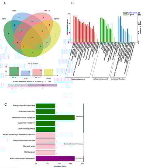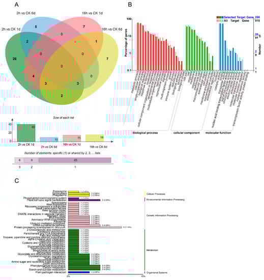 The effect of different 1-MCP treatments on the expression of miRNA. (A) The number of DEMs (differential expressed miRNAs) derived from comparison between the 1-MCP treatments (2 h) in 1- and 6-day samples and the control samples at each time point, and the number of DEMs derived from comparison between the 1-MCP treatments (16 h) in 1- and 6-day samples and the control samples at each time point. The Venn software package (http://bioinformatics.psb.ugent.be/webtools/Venn/) was used for the Venn diagram. (B) GO classification of the predicted targets of target genes in the 1-MCP (16 h) 1- and 6-day samples compared to the control, and the 1-MCP (2 h) 1- and 6-day samples compared to the control at each time point. (C) KEGG classification of the predicted targets of target genes in the 1-MCP (16 h) 1- and 6-day samples compared to the control, and the 1-MCP (2 h) 1- and 6-day samples compared to the control at each time point.