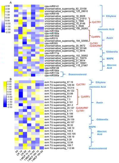 Expression profiles of DEMs (differentially expressed miRNAs) and their candidate target genes in hormone signal pathways. (A) Heat map display of DEM expression profiles involved in plant hormone signaling metabolic pathways under 1-MCP treatment combined with the degradation analysis. (B) Heat map display of the candidate target genes of DEMs involved in plant hormone signaling metabolic pathways under 1-MCP treatment combined with the degradation analysis.