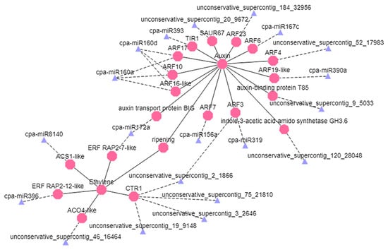 According to the analysis of small RNAs, degradome, and transcriptome sequencing, the miRNAs related to ethylene and auxin signaling were selected and visualized. The cpa-miR160a and cpa-miR160d miRNAs co-targeted CpARF10, CpARF16-like, and CpARF17, thereby affecting auxin signaling and fruit ripening. The cpa-miR172a miRNA targeted CpERF RAP2-7 and Carica papaya auxin transport protein BIG, and unconservative_supercontig_2_1866 targeted CpARF3 and CpCTR1, thereby affecting the signaling pathways of ethylene and auxin simultaneously (Figure 7).