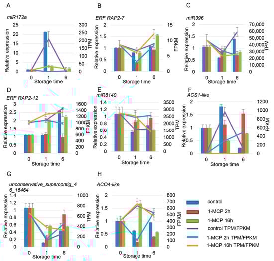 Expression pattern validation of selected DEMs (differentially expressed miRNAs) and their target genes related to the ethylene signaling pathway under different 1-MCP treatments. The histograms were plotted using data obtained from RT-qPCR, and the corresponding line chart was plotted using TPM/FPKM values from the RNA-seq analysis. (A–H) are miRNA and the their target gene pairs. (A,C,E,G) are the miRNA, and (B,D,F,G) are the corresponding target gene, respectively. Different colors indicate different samples. The expression of samples at 0 DAT was set to 1. ACT and TBP1 were used as references, which were validated by Zhu et al. (2012).
