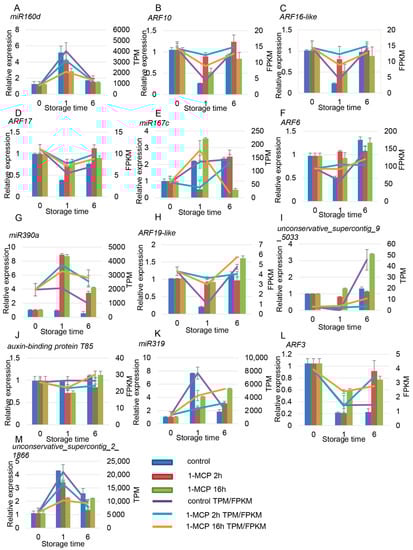 Expression pattern validation of selected DEMs (differentially expressed miRNAs) and their target genes related to the auxin signaling pathway under different 1-MCP treatments. The histograms were plotted using data obtained from RT-qPCR, and the corresponding line chart was plotted using TPM/FPKM values from the RNA-seq analysis. (B–D) are the target genes of (A); (F) is the target genes of (E); (H) is the target genes of (G); (J) is the target genes of (I); (L) is the target genes of (K,M). Different colors indicate different samples. The expression of samples at 0 DAT was set to 1. ACT and TBP1 were used as references, which were validated by Zhu et al. (2012).