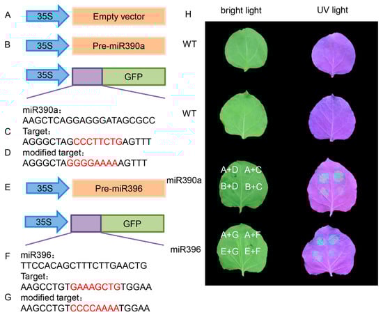 Confirmation of miRNAs and their targets in tobacco. (A–G) Diagrams of the plasmids used in these experiments. (A) Empty vector; (B) 35s::pre-miR390a vector that overexpresses Cpa-miR390a; (C) 35s::CpARF 19-like-GFP vector that overexpresses CpARF19-like; (D) 35s::MCpARF 19-like-GFP vector that overexpresses GFP carrying a modified target; (E) 35s::pre-miR396 vector that overexpresses Cpa-miR396; (F) 35s::CpERF RAP2-12-like-GFP vector that overexpresses CpERF RAP2-12-like; (G) 35s::MCpARF RAP2-12-like-GFP vector that overexpresses GFP carrying a modified target; (H) GFP picture of tobacco.