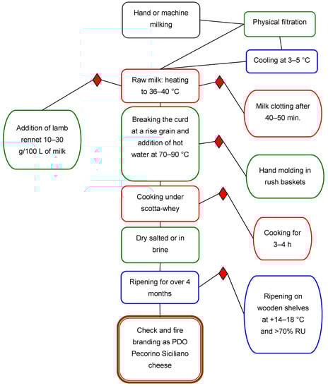 Pecorino Siciliano is a traditional Italian PDO cheese produced throughout Sicily. It is a semi-hard cheese that is manufactured using traditional techniques, i.e., from raw ewe’s milk without any bacterial starters, according to production protocol (GUCE C 170 EUR-Lex-52020XC0518(03)) (Figure 1). Artisanal cheese-making that uses traditional wooden equipment causes a microbiota that is responsible for acidifying curd and maturing cheese that originates from raw milk. This impacts the equipment, the animal rennet, and the transformation of the dairy environment [2]. PDO Pecorino Siciliano cheese is defined as a semi-cooked cheese because the cheese is cooked under hot scotta whey. Scotta whey is a residual product created during the extraction of ricotta cheese; normally, it is used for cooking pecorino cheeses at 74–78 °C for at least two to three hours. The production protocol does not consider where cooking takes place; therefore, some producers use wooden vats and others use steel. Moreover, some producers use either steel or copper boilers. It is well known that the size and type of the container used to cook cheese influences the degree of heat penetration, as does the amount of scotta whey used and its temperature.