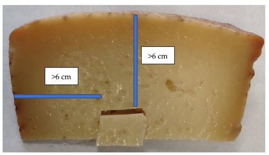 All samples were analyzed at the core. Altogether, 98 cheeses samples were taken from the central part of the slice (core), and the distance from the core to the surface was measured (Figure 2). The size of the Pecorino wheels, about 7 kg in weight, gave a height of 17 cm and a diameter of 25 cm.