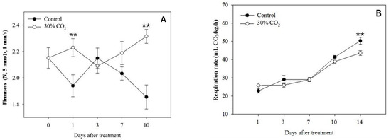 Changes in fruit firmness (A) and respiration rate (B) of strawberry fruits (Fragaria × ananassa Duch. ‘Seolhyang’) treated with 30% CO2 for 3 h, as well as control fruits. The data are expressed as the means ± standard errors of 15 replications. ** p < 0.01.