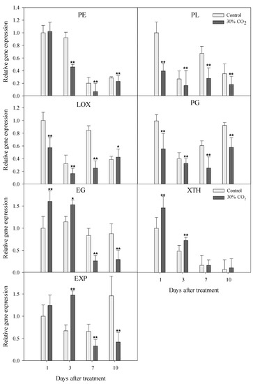 Expression levels of genes encoding cell wall-degradation enzymes in strawberry fruits treated with 30% CO2 for 3 h, as well as control fruits. PE, pectinmethylesterase; PL, pectate lyase; LOX, lipoxygenase; PG, polygalacturonase; EG, endo-β-1,4-glucanase; XTH, xyloglucan endotransglucosylase/hydrolase; EXP, expansin. * p < 0.05; ** p < 0.01.