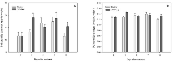 The contents of polyuronides (Figure 3A) and water-soluble pectin (Figure 3B) in the crude cell wall extracts showed a diversity of pectin polymers. Significant differences in polyuronide contents were observed between the crude cell wall of the CO2-treated and control groups. After one day, the polyuronide contents of the crude cell wall extracts were 2.13 mg/g dry weight in control fruits and 2.36 mg/g dry weight in high-CO2-treated fruits. After 10 days, the polyuronide contents of the crude cell wall extracts were 2.06 mg/g dry weight in control fruits and 2.22 mg/g dry weight in high-CO2-treated fruits (Figure 3A).