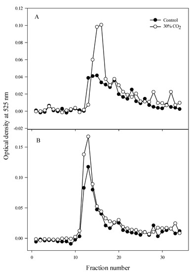 Size-exclusion experiments were performed using column chromatography and water-soluble pectin. The galacturonic acid contents were measured in 35 different fractions (Figure 4), and showed similar trends between the high-CO2-treated and control fruits. A difference in the processing interval was observed between fractions 10 and 20. The galacturonic acid content was higher in high-CO2-treated fruits than in control fruits 3 h after treatment, as well as 10 days after treatment. After 3 h, the galacturonic acid content in fraction 15 was 0.04 mg/mL in control fruits and 0.1 mg/mL in high-CO2-treated fruits (Figure 4A), and after 10 days, the galacturonic acid content in fraction 12 was 0.12 mg/mL in control fruits and 0.17 mg/mL in high-CO2-treated fruits (Figure 4B).