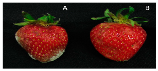 Growth of Botrytis cinerea on strawberry fruits seven days after inoculation. (A): control; (B): 30% CO2 treatment.