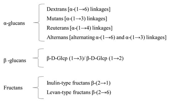 | Inulin-type (fructose) | Streptococcus mutans, Lactobacillus reuteri | Health benefits: prebiotic activity Food industry: sugar and fat replacer, texture modifier in low-fat dairy products enhancer of creaminess |