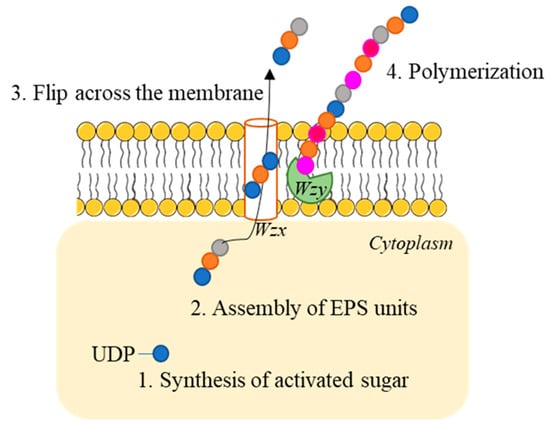 - Assembly of EPS units: sugar nucleotides are added via membrane-bound GT.