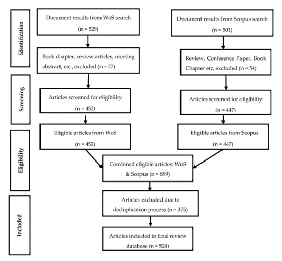 From the WoS and Scopus databases, 529 and 501 documents were retrieved, respectively, as shown in Figure 1. While 77 documents were excluded from the WoS, 54 documents were excluded from Scopus during the screening process. A total of 899 documents, therefore, met the eligibility criteria, out of which 375 documents were further excluded, due to deduplication, leaving a total number of 524 documents that were finally used in the review.