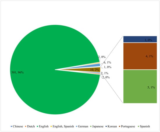 The findings of the study also indicated that the majority of the articles were published in English (n = 501, 96%). Other languages identified follow the order: German (n = 6, 1%), Spanish (n = 5, 1%), Portuguese (n = 4, 1%), Chinese (n = 2, 1%), Dutch (n = 2, 0%), English/Spanish (n = 2, 0%), Korea (n = 1, 0%) and Japanese (n = 1, 0%), as shown in Figure 2. Studies have shown the importance of publishing scientific findings in English. Researchers whose first language is not English are pressured to publish their scientific articles in English [43,44]. While some researchers prefer to use their first non-English languages, especially when the language is used globally, most researchers prefer to use English because of the desire to disseminate their findings to a wider audience, the internationalization of many Universities and research institutes, as well as many scientific journals insisting on the English language [45].