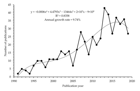 The number of publications between 1991 and 2019 follows a fairly ascending order with an annual growth rate of 9.74% (R2 = 0.8358), as shown in Figure 3. Although, a sharp decline in the research outputs in 2005 was observed, which eventually peaked in 2007. This was followed by another sharp decline in 2009, and an increase in 2010. The highest peak of the research outputs was observed in 2013 and has remained unsteady till 2019. The fluctuations in research trends indicate that the publication of Arcobacter-related research has not been steady throughout the survey period. This is probably attributed to certain factors, such as available research funds and qualified postgraduate students who can take up Arcobacter-related research. Moreover, Arcobacter is an emerging pathogen whose evolutionary mechanisms, genetic and ecological diversity are not well understood, hence have not gained much interest from the scientific community. Despite the fluctuations, it is encouraging that there is a steady increase in Arcobacter-related research outputs, since the pathogen exhibits significant public health and food safety importance.
