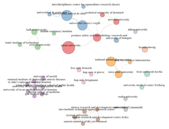 The present study identified nine institutional collaboration networks involved in Arcobacter-related research, as shown in Figure 5. These institutions vary from ministries to research institutes and Universities. Such collaborations have contributed to the progress of science. For instance, researchers from Edinburgh University collaborated with researchers from Harvard University, Peking University, Johns Hopkins University, and Nossal Institute for Global Health at Melbourne University to map out the leading causes of infant mortality in China and how it can be prevented [53,54]. Additionally, institutional partnerships provide opportunities for students and staff members to diversify their research, increase their cultural awareness and have international experiences [53].