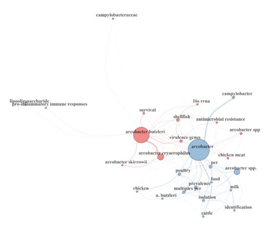 The most frequently occurred keywords were Arcobacter, poultry, shellfish, cattle, and chicken, while the least occurred keywords were vegetables and rivers, as shown in Table S1. This finding is not surprising as most studies on Arcobacter have been on poultry, chicken, and pork [46]. Moreover, poultry serves as an important reservoir of Arcobacter spp. and acts as a significant source of spread [47,48]. Although some studies have identified Arcobacter spp. in water and vegetables [46], our study demonstrated that there are fewer interests within these two niches based on the generated keywords. Interestingly, the highest average growth rate of Arcobacter-related research based on the generated keywords was shellfish with an AGR of 0.7, as shown in Table S1. This indicates an increasing interest in Arcobacter-related research with a particular focus on shellfish.