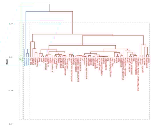 The keywords co-occurrence collaboration map depicts the hotspots and maps the trends of Arcobacter-related research, while the authors’ keyword clusters groups the keywords that have a high correlation with each other [55]. Three keyword collaboration networks (Figure 6) and three keyword clusters (Figure 7), were identified in the present study. The first network (red color) has about 10 nodes (high-frequency words) whose sizes vary depending on the frequency of occurrence of the words. They include “Arcobacter butzleri”, “Arcobacter cryaerophilus”, “shellfish”, “virulence genes”, “chicken meat”, “antimicrobial resistance”, “survival”, “Arcobacter spp.”, “16S rRNA”, “chicken meat” and “Arcbacter skirrowii”. Words that frequently appear together in the same source are connected by red lines. Looking at these keywords, it is indicated that hotspots of Arcobacter-related research are within these areas and are ranked first in the hierarchical clustering of authors’ keywords. In the same vein, the second network (blue color) has about 14 nodes whose sizes vary depending on the frequency of occurrence of the words. Words like “Arcobacter”, “Arcobacter spp.”, “Multiplex PCR”, “poultry”, “PCR”, “prevalence” had the largest size of nodes, hence are the frequently occurred words in this network. These keywords indicate an increasing area of research interest and are ranked second in the hierarchical clustering of the authors’ keywords. The third network has only two nodes (green color) whose sizes are very small, indicating a low frequency of occurrence and lack of research interest, thus ranked third in the hierarchical clustering of the authors’ keywords.