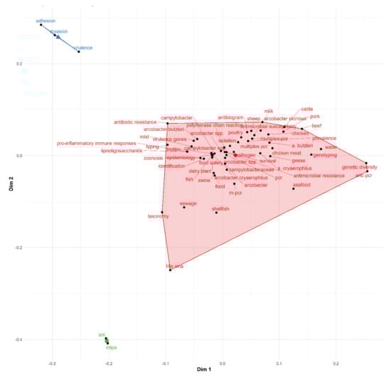 A conceptual framework depicts what is expected to be found in research. In the present study, three polygons representing three major themes of Arcobacter-related research based on authors’ keywords were presented in the common conceptual frames via the k-means clustering, as shown in Figure 8. Based on the generated keywords, the following themes which represents the area where Arcobacter-related research is greatly focused on include: (i) The detection and isolation of Arcobacter spp in animals, foods, and food environment using molecular methods, which are presented in the red polygon., (ii) Pathogenesis of Arcobacter spp. presented in the blue polygon., and (iii) genetic diversity of Arcobacter presented in the green polygon. Since Arcobacter spp. have been identified as an emerging foodborne pathogen with public health significance, research within these themes seems to be balanced. However, more research in the area of antimicrobial resistance and the epidemiology of the diseases caused by this pathogen should be encouraged.