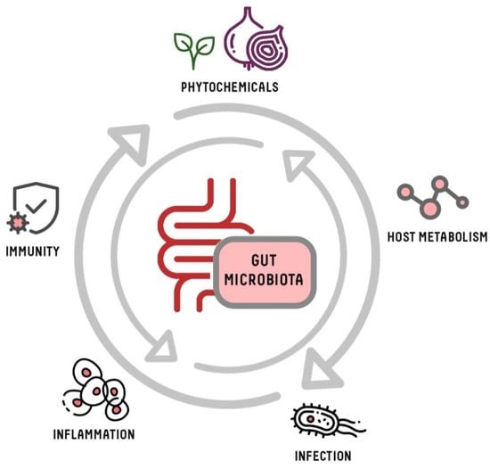 Dietary strategies conducted with prebiotics and probiotics are able to modulate the composition and functionality of the human GM []. Other dietary habits, such as high consumption of fruits and vegetables, can also significantly improve the biodiversity of GM because of their high content in bioactive phytochemicals [,]. Phytochemicals are natural compounds produced by plants to help them to resist fungi, bacteria and plant virus infections and also to avoid their consumption by insects or other animals []. The most common found in foods are polyphenols, carotenoids, phytosterols, alkaloids, glucosinolates, terpenes and organosulfur compounds (OSCs) []. As shown in Figure 1, phytochemicals may also affect the composition and structure of GM, and consequently impact the host metabolism, inflammatory response or development of infections.