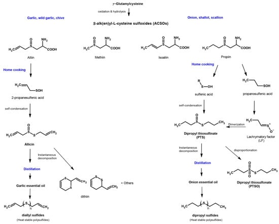 Nevertheless, thiosulfinates are also highly reactive molecules and, under certain conditions, can decompose to form other sulfur compounds, including symmetric or asymmetric thiosulfonates and sulfides [,]. Depending on the Allium species, the pathways for the transformation of thiosulfinates and the derivatives formed may differ. In the case of garlic, alliin (S-allyl-L-cysteine sulfoxide) is the most important precursor. It is distributed into the cellular cytoplasm and, when the garlic is chopped or crushed, the contact of alliin and alliinase produces allyl sulfenic acid and dihydroalanine. Two molecules of allyl sulfenic acid are condensed, forming allicin (diallyl thiosulfinate), which is the most important OSC of the genus [,]. However, allicin is extremely unstable and, at room temperature, is rapidly transformed by different mechanisms in other compounds such as ajoene, dithiins or diallyl disulfide. In onion, the most common sulfur compounds are isoalliin (S-propenyl-L-cysteine sulfoxide) that changes into lachrymatory factor (Z-propanethial S-oxide); methiin (S-methyl-L-cysteine sulfoxide), also found to be present in garlic; and propiin (S-propyl-L-cysteine sulfoxide) that, due to the action of alliinase, leads to dipropyl thiosulfinate (PTS) []. Although PTS is more stable than allicin, it is also a labile compound that, as happens with other thiosulfinates, is transformed into dipropyl disulfide and propyl-propane thiosulfonate (PTSO) through dismutation or disproportionation reactions [] (Figure 2).
