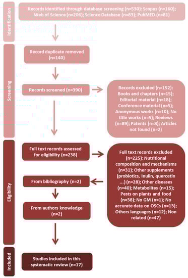 Two additional articles were also found to be eligible from the bibliography section of the 238 pre-selected works. Two extra articles not identified by the electronic databases were added as the authors were aware of their existence. Finally, as shown in Figure 3, a total of 17 articles [,,,,,,,,,,,,,,,,] were found to be eligible for the present systematic review following the full-text eligibility assessment. The characteristics of the selected articles are summarized in Table 1. This table collects an overview of these articles, which includes the type of Allium product used (OSCs or raw extract), the doses applied, evaluation model (in vitro or in vivo), the length of the study and the main findings related to their beneficial effects in gut health (Table 1).