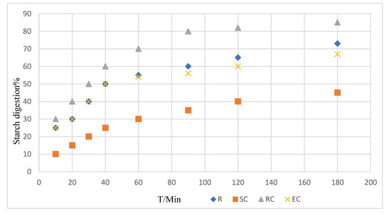 Digestion process of adzuki bean powder prepared by different processing methods. R: raw adzuki bean powder, SC: steamed cooking adzuki bean powder, RC: roller cooking adzuki bean powder, EC: extruded cooking adzuki bean powder.