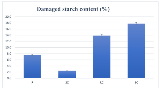 Figure 1 displays the digestive kinetics curve of adzuki bean powder with different cooking methods. It shows that the SC and EC methods have relatively lower digestion rates compared with the RC. As shown in Table 1, cooking methods with the lowest eGI to the highest were: steamed cooking (SC, 49.7), extrude cooking (EC, 70.0) and roller cooking (RC, 80.1). The results showed that the final starch digestibility and eGI value of the SC samples decreased significantly compared with uncooked adzuki bean powder samples (R, 79.8). SC had a low content of damaged starch (2.44%, as shown in Figure 2) so the starch granules were almost intact, which required more heat to gelatinize the starch, whereas the EC (17.74%) and RC (13.86%) had a higher content of damaged starch, which may result in easier digestion. Compared with SC followed by wet milling, more mechanical and thermal energy were produced by EC and RC with the initial use of the dry milling for the raw bean flour, resulting in higher levels of damaged starch content [32]. The result has been supported by Dhital et al. [33], suggesting that during cooking processing, the cellular integrity of pulses remained and most of the starch granules retained an ordered structure, which could slow down the digestion rate to a great extent.