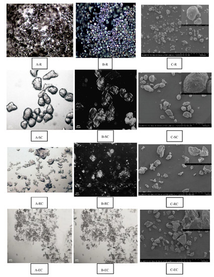 (A) polarized light, (B) bright field, (C) scanning electron micrographs showing adzuki bean powder with different processing methods. R: raw adzuki bean powder, SC: steamed cooking adzuki bean powder, RC: roller cooking adzuki bean powder, EC: extruded cooking adzuki bean powder.