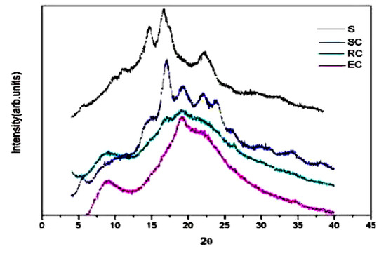 Moreover, starch relative crystallinity is an important parameter to characterize the crystallization properties of starch granules. With different processing methods (i.e., SC, RC and EC), the relative crystallinity of the adzuki bean powder starch decreased from 20.2% (R) to 17.13% (SC), 12.27% (RC) and 10.23% (EC), respectively. This explains that the processing methods can partially destroy the ordered structure of starch crystallinity [34,35,36]. The variation of relative crystallinity was small after SC treatment. It was speculated that the gelatinization of starch granules was more restricted by the cell wall and other components of the cell, and so the change in the ordered structure of starch granules was limited.