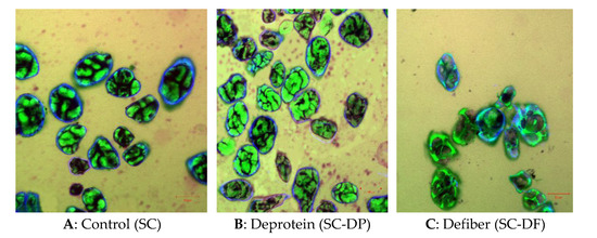 Light microscope images of adzuki bean powder treated with steam cooking with Protamax and Viscozyme are shown in Figure 5A,B. Protamax and Viscozyme were used to effectively degrade the protein and cell wall fibrous tissue and increase the release of cellular contents. A scanning electron microscope (SEM) of steam-cooked adzuki bean powders with Protamax (deprotein) and Viscozyme (defiber) are shown in Figure 5C.