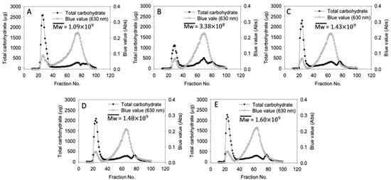 Starch molecular size distribution of water caltrop starch. (A) Native-S, (B) cHMT1-S, (C) cHMT2-S, (D) cHMT4-S, (E) cHMT8-S.