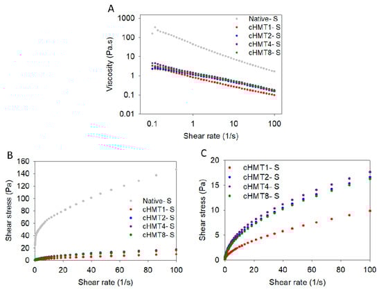 Steady shear rheological properties of native and cHMT water caltrop starch paste. (A) Viscosity versus shear rate. (B) Shear stress versus shear rate of native and cHMT starch. (C) Shear stress versus shear rate of cHMT starch.