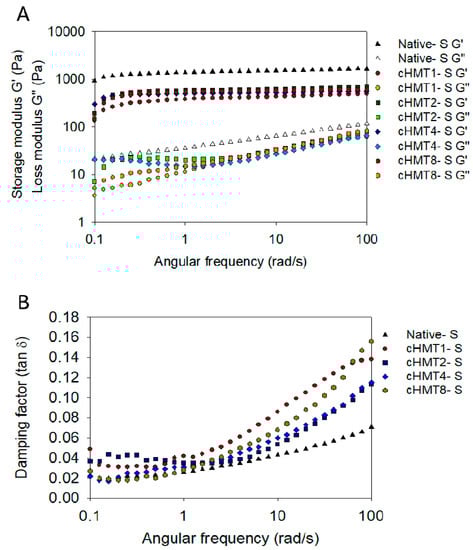 Dynamic rheological behavior of native and cHMT water caltrop starch. (A) Angular frequency dependence of G′ and G″ at 25 °C for starches; (B) angular frequency dependence of tan 𝛿 at 25 °C for starches.