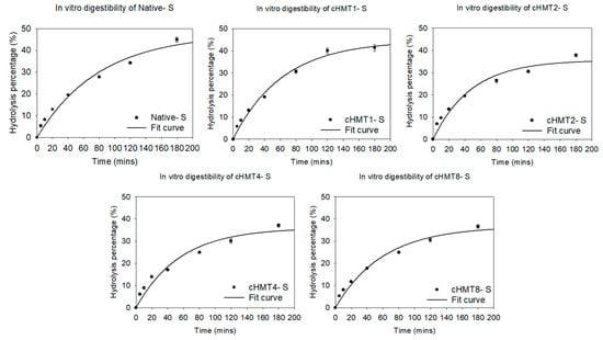 As shown in Table 5, the HP∞ of samples decreased significantly after modification; this may be due to the more ordered structure formed by repeated heating/cooling cycles in cHMT [23]. However, cHMT1-S with a single cycle of treatment had lower HP∞, which may be ascribed to strong disruption to double helices and reduced formation of ordered structure, which resulted in more vulnerability to the enzyme.