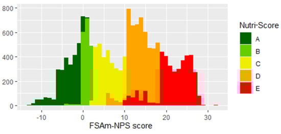 Our final sample consisted of 15,822 products, including 2578 dairy products, 1999 bread and bakery products, 1938 confectionery products, 1822 fruits and vegetables, 1644 meat and meat products, 1636 cereal and cereal products, 1152 beverages, 973 sauces and spreads, 571 convenience foods, 503 fish and fish products, 492 edible oils and emulsions, 485 snack foods, and 29 types of eggs. The overall distribution of products across NS grades is displayed in Figure 1. Overall, 16.5% of products were classified as grade A, 11.5% as B, 18.6% as C, 29.2% as D, and 24.2% as E. The mean FSAm-NPS score was 9.9 ± 9.5 points. This distribution also shows spikes, indicating that several products are on the border of higher NS grades (n = 2378; 15%).