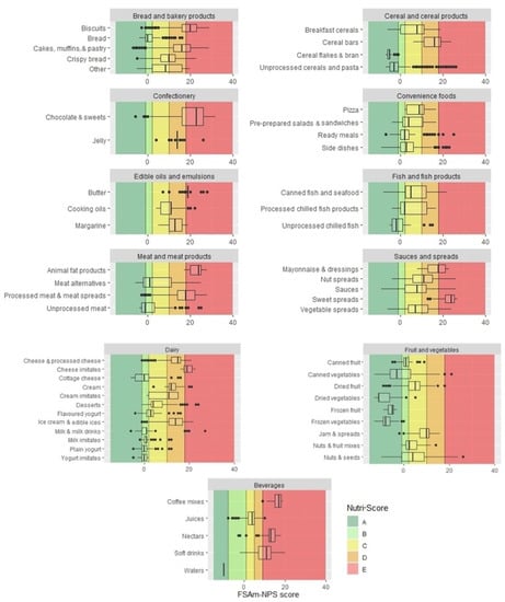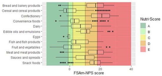 Distribution of FSAm-NPS score for main food categories (n = 15,822). Vertical lines represent borders of five Nutri-Score grades from A to E. Left boundary of the box represents 25th percentile, line in the box is median, and right boundary represents 75th percentile. Error bars represent lower limit (25th percentile − 1.5 × (interquartile range)) and upper limit (75th percentile + 1.5 × (interquartile range)). Black circles are individual outliers.