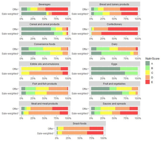 To investigate to what extent consumers would be exposed to different NS grades in specific food groups, we applied the sale-weighted approach. The analysis was performed on a subsample of foods for which 12-month national sales data were available (n = 10,402). The results show that in most categories, food supply approximately reflected sales data, but larger differences were observed in specific categories. In seven categories, sale-weighted data showed more favourable distribution of NS, with a higher proportion of better NS grades (Figure 4). This difference was particularly obvious among beverages, where waters (graded A) represented more than half (53.1%) of all sold beverages. A notable difference was also seen for dairy products, among which healthier products (graded A or B) represent 39.1% of offerings and 83.4% of sales. A similar result was seen for fruits and vegetables, with 54.1% of offerings of healthy products but 80.9% of sales. The sale of products with lower nutritional quality (graded D or E) was higher for six categories: edible oils and emulsions, confectionery, snack foods, sauces and spreads, fish and fish products, and meat and meat products. Most of these categories also had a lower proportion of healthy offerings. Offerings were not aligned with sales data, especially for edible oils and emulsions, where proportions of offerings with NS grades of C (43.1%) and D (41.5%) were similar, but after sale-weighting, products graded D represented 70.9% of sales. A difference was also seen for sauces and spreads, where products with the lowest nutritional quality (graded E) represented only 17.7% of offerings but 38.1% of sales (see Table S2).