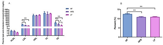 (A) Plasma lipid and cholesterol level in mice fed high-fat (HF) diet, high-fat diet containing 20% cooked black turtle bean (HFB) and low-fat (LF) diet for 6 weeks. (B) Hepatic total lipid content in mice fed with high fat (HF) diet, high-fat diet containing 20% cooked black turtle bean (HFB) and low-fat (LF) diet for 6 weeks. VLDL: very low-density lipoprotein; LDL: low-density lipoprotein; HDL: high-density lipoprotein; TC: total cholesterol; TG: triglyceride. * p < 0.05, ** p < 0.01 between groups.