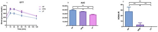 To understand glucose clearance from circulation and the insulin sensitivity of mice fed different diets, Glucose tolerance test (GTT) curve, the area under curve (AUC) and HOMA-IR index were investigated and shown in Figure 2A–C. Glucose clearance from circulation in mice fed HFB diet was manifested by 9% lower (p = 0.0005) AUC in comparison with HF. Insulin sensitivity was also improved as shown by 88% lower HOMA-IR index of mice fed HFB diet than those HF diet. HFB diet tended to lower blood glucose at 15, 60, and 120 min but did not reach statistical significance (p > 0.05). However, Tanaka et al. [] reported lower peak glucose of GTT in mice on high-fat diets fats supplemented with boiled red kidney beans for 10 weeks. In the same study, the GTT of roasted red kidney beans was not different from high-fat controls. The researchers suggested that multiple synergistic effects of various components of the boiled beans were responsible.