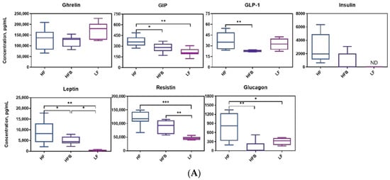 Since HOMA-IR of mice were diminished by HFB diet, the levels of circulating proteins involved in the regulation of glucose metabolism were measured. Concentration of diabetes and obesity related biomarkers are shown in Figure 3A. Mice fed HFB diet had 23.4%, 21.6%, 43.2% and 52.1% lower GIP, GLP-1, leptin and glucagon concentrations than those on HF diet, respectively. Plasma ghrelin, insulin and resistin levels of the HFB and HF diets were not different. However, in the LF and HFB groups, insulin was below the detection limit in 8 and 3 samples, respectively, whereas, of the 8 samples analyzed, all mice in the HF group had detectable levels of insulin. Concentration of diabetes and obesity related biomarkers are shown in Figure 3A. Mice fed HFB diet had 23.4%, 21.6%, 43.2% and 52.1% lower GIP, GLP-1, leptin and glucagon concentrations than those on HF diet, respectively. Plasma ghrelin, insulin and resistin levels of the HFB and HF diets were not different. However, in the LF and HFB groups, insulin was below the detection limit in 8 and 3 samples, respectively, whereas, of the 8 samples analyzed, all mice in the HF group had detectable levels of insulin.