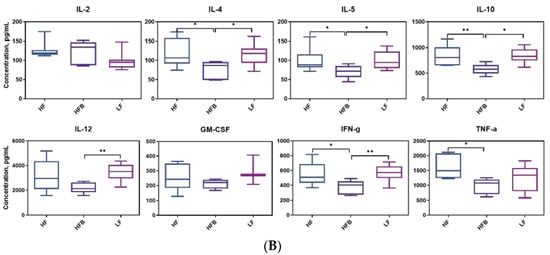 The lack of significance between the HF and LF treatments was partly due to the higher variance in the LF diet group and perhaps insufficient length of the feeding phase to generate an immune response. The latter is suggested by a study by Kobori et al. [] who found that TNF-α levels were 2.4, 4.7 and 7.3 times higher in C57BL/6J mice fed HF diet for 4, 8, and 20 weeks, respectively, compared to AIN-93G (LF) control. Other studies have shown differences after 8 weeks []. Although there were no differences in cytokines between HF and LF feeding, there were differences between HF and HFB diet groups. Plasma IL-4, IL-5, IL-10, IL-12, IFN-g and TNF-α concentrations of mice fed HFB diet were 34.3%, 30.82%, 31.30%, 31.34%, 30.19% and 30.81% less than those on HF diet. IL-10 is an anti-inflammatory cytokine that responsible for inhibiting TNF-α, IL-12 and IFN-γ secretion []. IL-4 was higher in spleens from mice fed high-fat diets cultured in phytohaemagglutin (PHA) compared to controls on LF diet []. Black turtle beans contain significant amounts of PHA but they are detoxified by cooking. In this study the body weights of mice on the HFB diet were lower than HF diet but not significantly. Higher intake of animal proteins were positively associated with inflammation in obese individuals and no correlation has been observed between plant protein intake and inflammation in obese subjects []. However, the mechanism of the effect of animal or plant based protein on inflammatory cytokines remains unclear. Food is a complicated system. Typically there are more than one component attributed to a health promoting effect. There are also some synergistic effects and antagonistic effects in the same foods. To better explain the positive effect of cooked black turtle bean on health promotion field, the separation, purification and functional evaluation of its components will be conducted in the future.