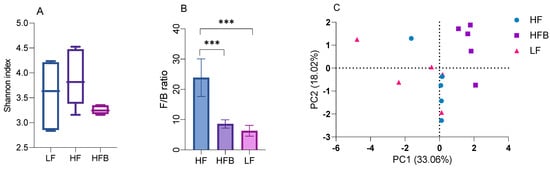 Box plots of (A) Shannon Index and (B) the ratio of Firmicutes to Bacteroidetes in mice fed each diet for 6 weeks, and (C) principal co-ordinate analysis (PCoA) plot of cecal microbial community data (D) the relative abundance of cecal microbiota at the Phylum level, and (E) the relative abundance of cecal microbiota at the Family level. *** p < 0.001 between groups.
